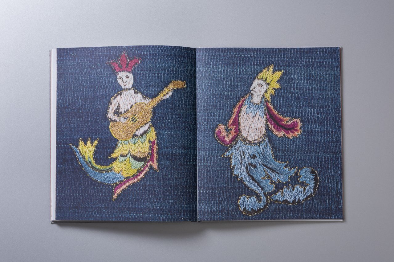 Poncho bordado en hilos de seda con motivos vegetales, animales, humanos y sirenas